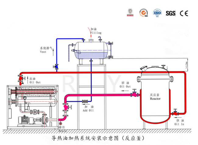 導(dǎo)熱油鍋爐是將加熱元件直接插入有機(jī)載體(導(dǎo)熱油)中直接加熱,利用循環(huán)泵,強(qiáng)制導(dǎo)熱油進(jìn)行液相循環(huán),將熱量傳遞給用一個(gè)或多種用熱設(shè)備,經(jīng)用熱設(shè)備卸載后,重新通過(guò)循環(huán)泵,回到加熱器,再吸收量,傳遞給用熱設(shè)備,如此周而復(fù)始,實(shí)現(xiàn)熱量的連續(xù)傳遞,使被加熱物體溫度升高,達(dá)到加熱的工藝要求。
